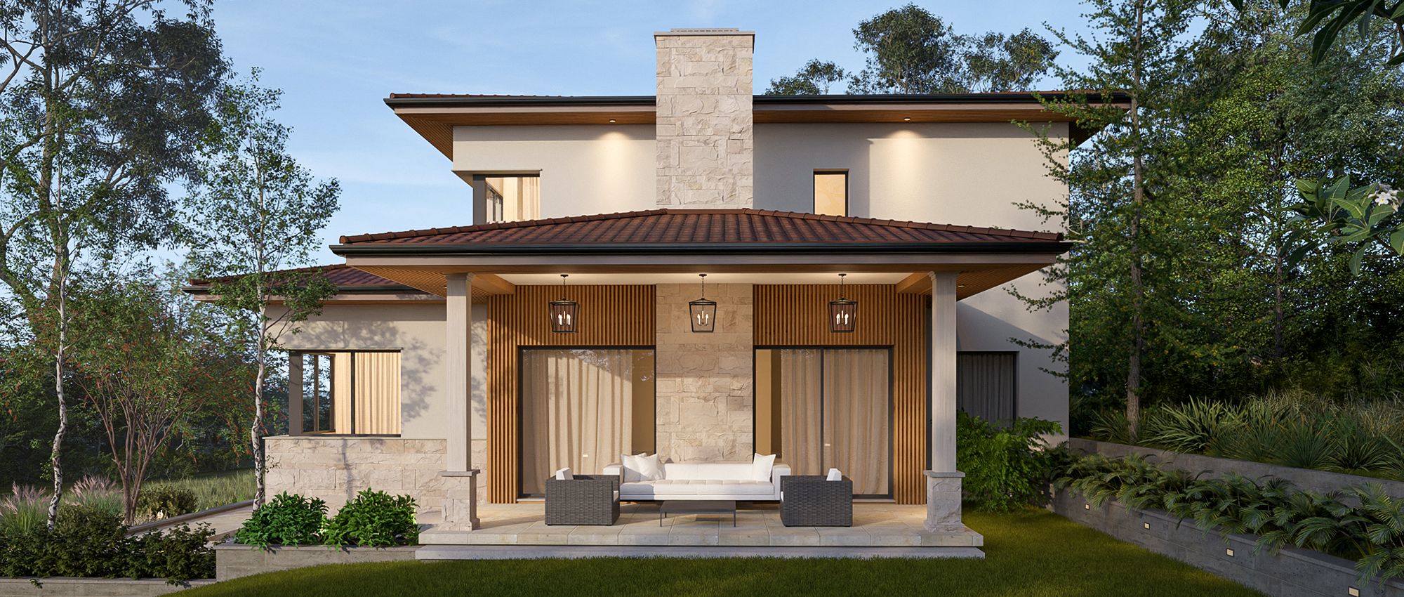 Arhitektonsko rješenje temelji se na kombinaciji suvremenog izraza i tradicionalnih elemenata – četverostrešni krov s naglašenim strehama, prirodni kameni oblog i tople neutralne boje fasade stvaraju bezvremenski karakter kuće. Velike staklene površine omogućuju obilje prirodnog svjetla te vizualnu povezanost interijera s vanjskim prostorima.