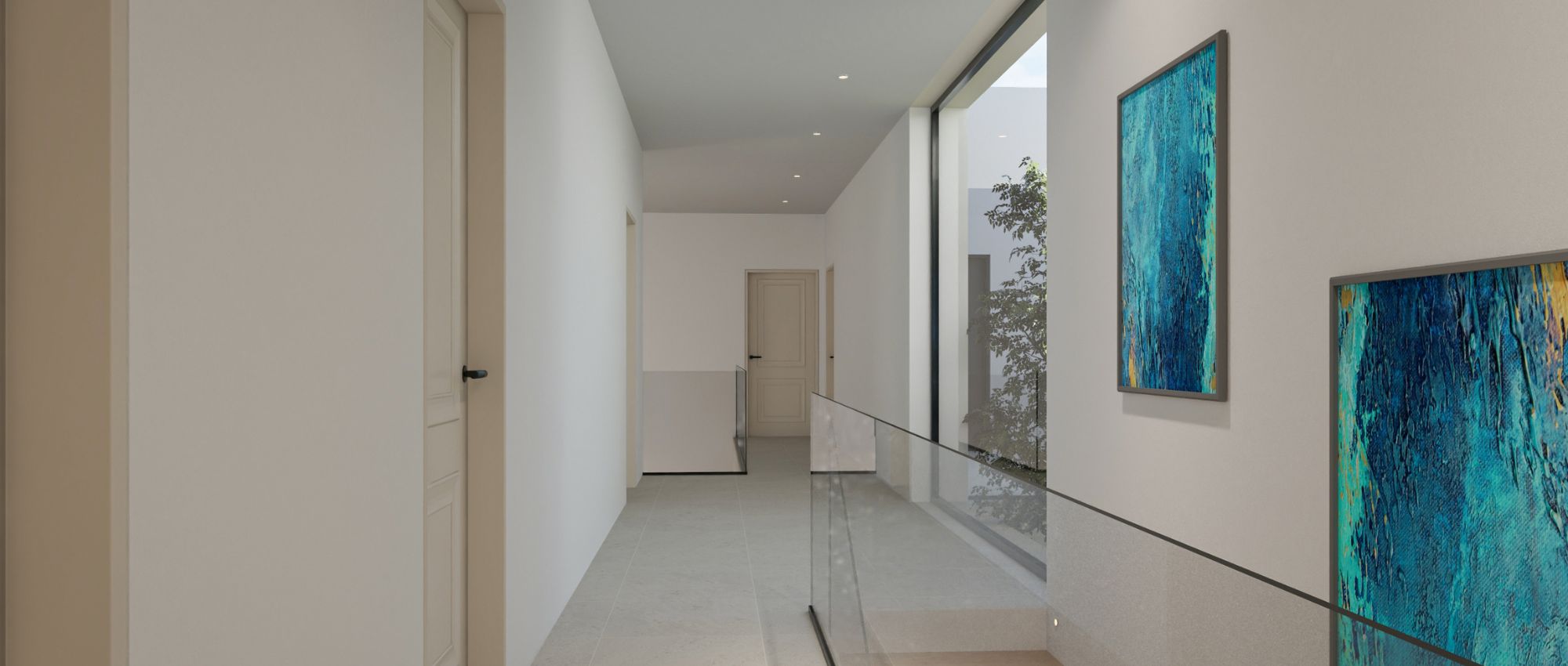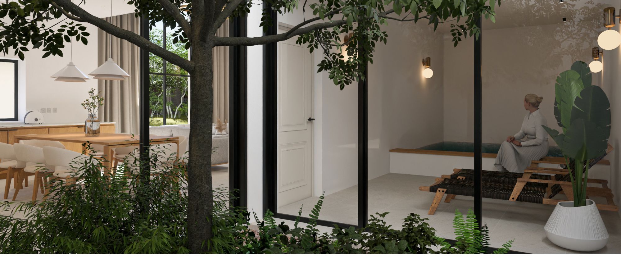 Na otvorenom dijelu prve etaže smjestili smo zeleni krov koji kući daje toplinu prirodnog materijala i sklad s okolišem. U središtu tlocrta nalazi se atrij, koji unosi svjetlost i stvara intiman unutarnji vrt, a uz njega je smješten wellness prostor sa zatvorenim bazenom, osmišljen za potpuno opuštanje i privatnost. Iznad dijela dnevnog boravka je galerija s visokom staklenom stijenom koja unosi dodano svjetlo u interijer.