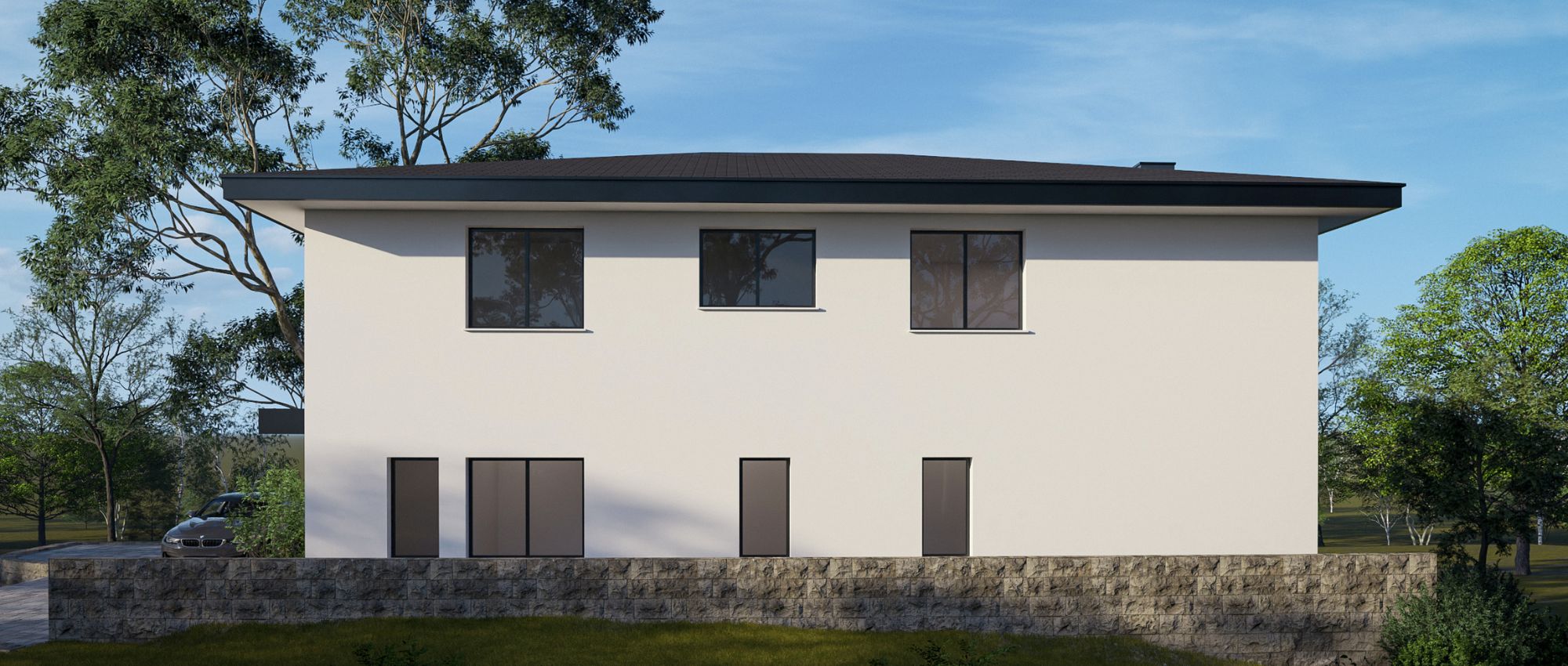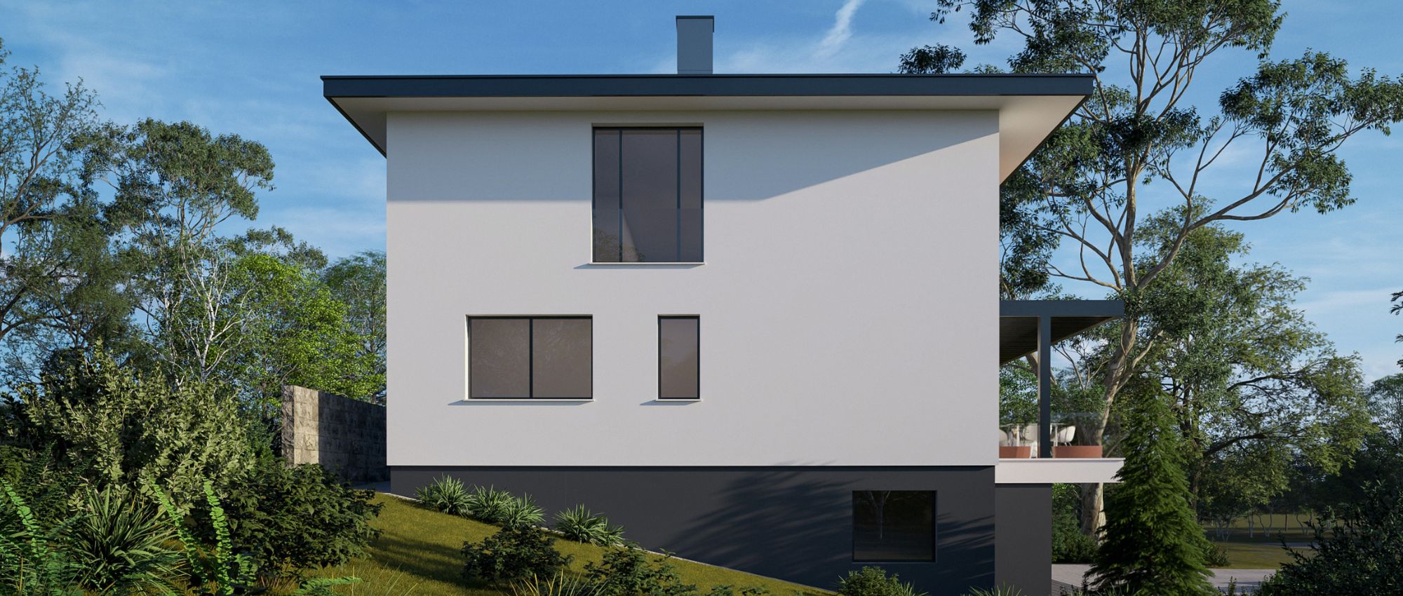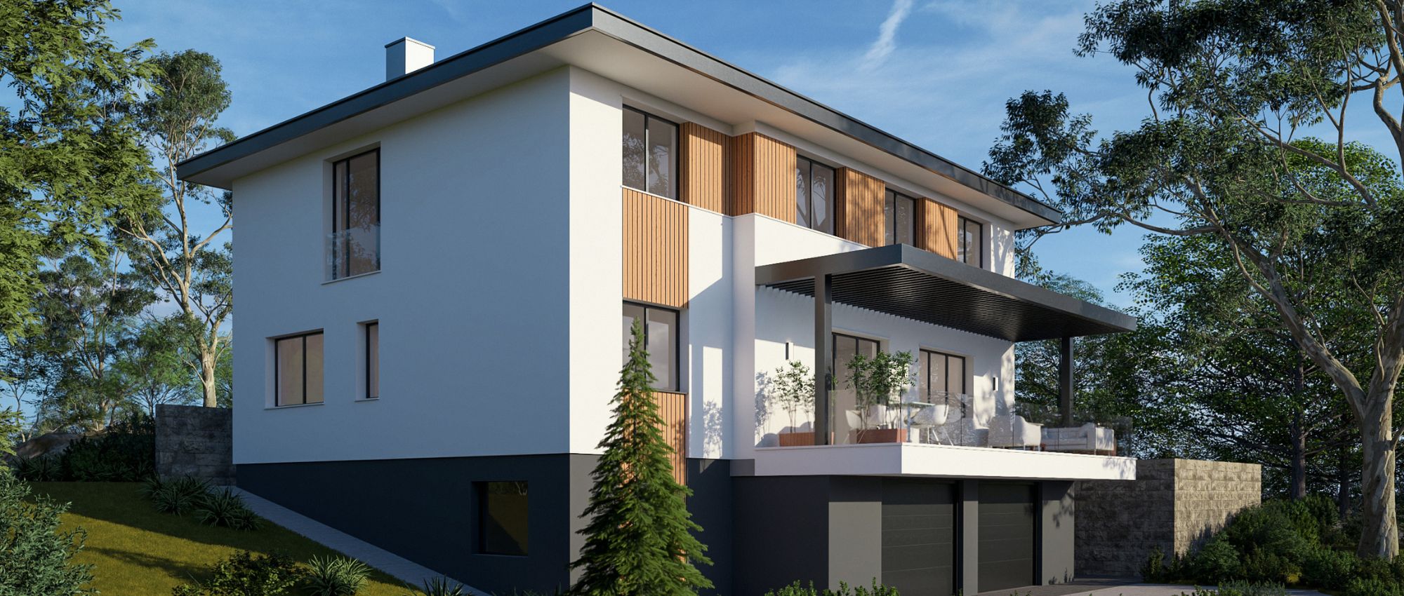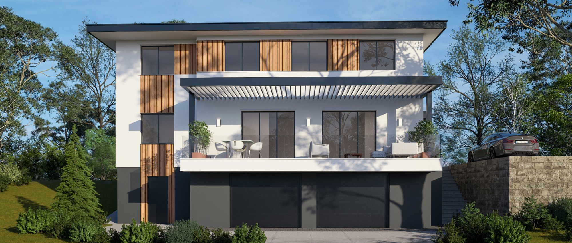 Na padini u Svetom Ivanu Zelini, mjestu koje postaje sve poželjnija lokacija za mlade obitelji, projektirana je moderna obiteljska kuća na tri etaže. Spoj klasične gradnje i suvremenog dizajna naglašen je čistim linijama, velikim staklenim površinama i elegantnim detaljima poput pergole i drvenih obloga.